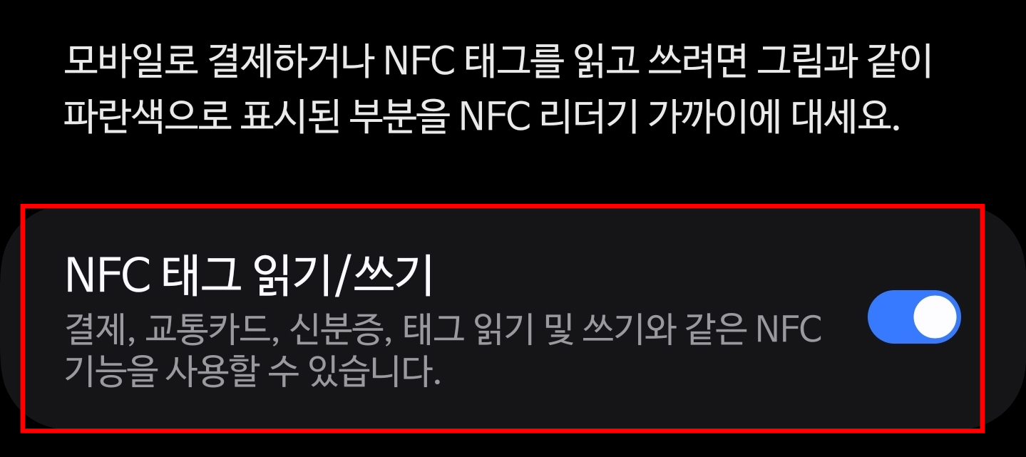 [NFC 및 비접촉 결제] 항목을 설정합니다. 이 옵션이 켜있으면 기본 모드, 비활성화 되어 있으면 카드모드입니다.