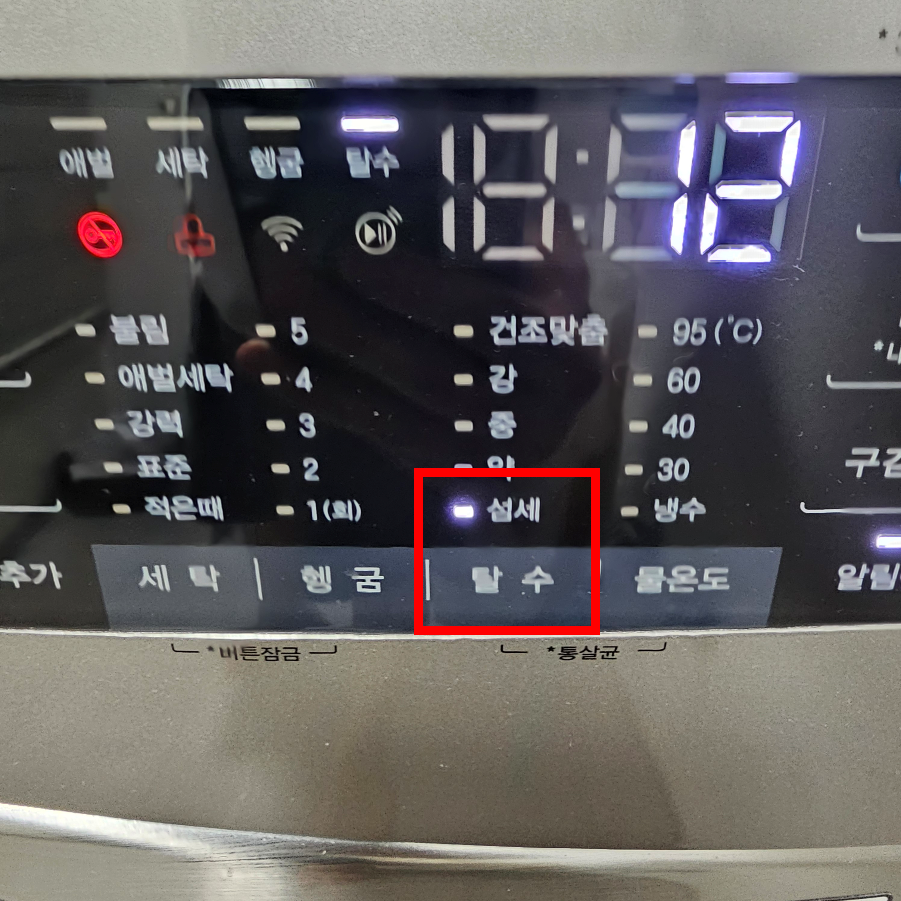 섬세모드 탈수로 물이 어느 정도 빠지면, 그다음에 원하는 탈수 강도로 다시 돌리는 것이 가능합니다. 이 방식으로 저는 UE 에러 없이 이불 빨래를 무사히 마칠 수 있었습니다.