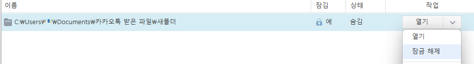 잠금을 해제하려면 프로그램을 열고 해당 폴더를 선택한 뒤 ‘잠금 해제’를 누르면 됩니다.