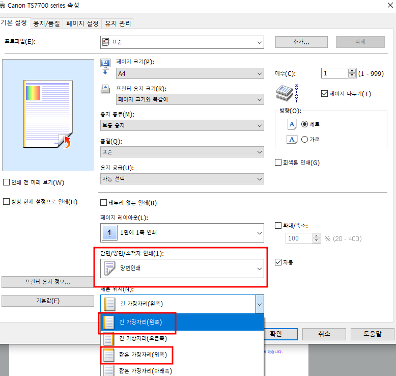 - 긴쪽으로 넘김: 세로 방향으로 넘길 때 적합. 일반 문서나 책자에 추천.