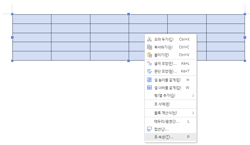 마우스 오른쪽 버튼을 누르고 나오는 메뉴에서 ‘표 속성’을 클릭합니다.